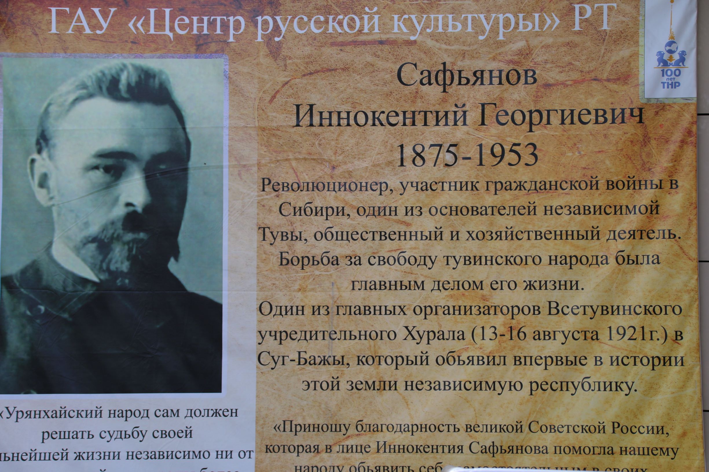 Сегодня в городе Кызыле состоялась торжественная церемония присвоения Центру русской культуры Республики Тыва имени одного из основателя тувинской государственности Иннокентия Георгиевича Сафьянова.