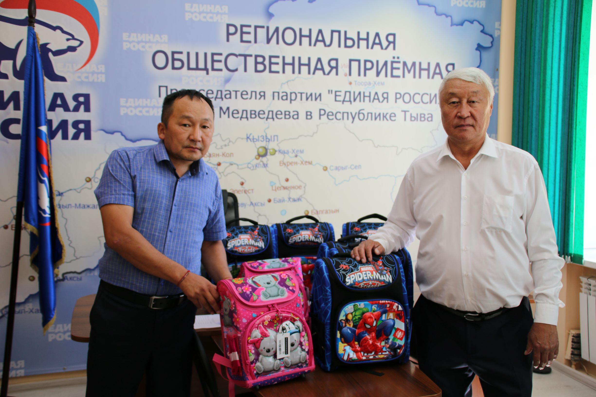 В Региональной общественной приемной «Единой России» подарки были переданы председателю администрации села Баян-Кол Хулер-оолу Байкара, который и вручит школьные рюкзаки детям.