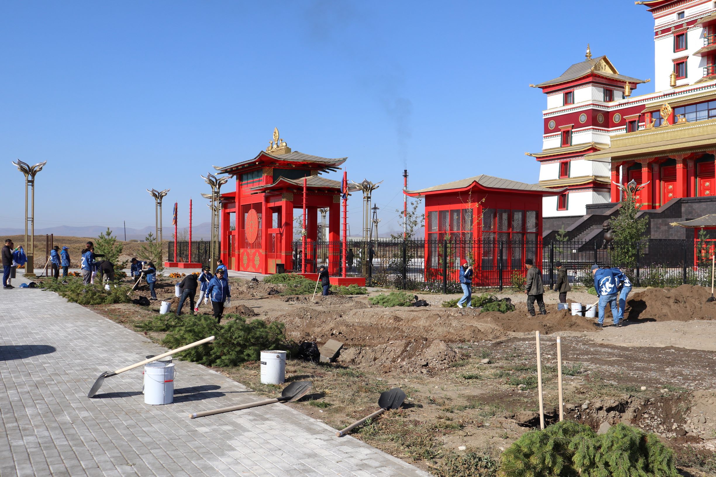 Саженцы сосен, привезенные из Балгазынского лесничества, силами депутатов – членов фракций «Единая Россия» в Верховном Хурале, Хурале представителей города Кызыла, молодежного крыла партии, сотрудников Аппарата парламента Тувы и регионального исполкома «Единой России» украсили прилегающую территорию крупнейшего в России буддийского монастыря «Тубтен Шедруб Линг».
