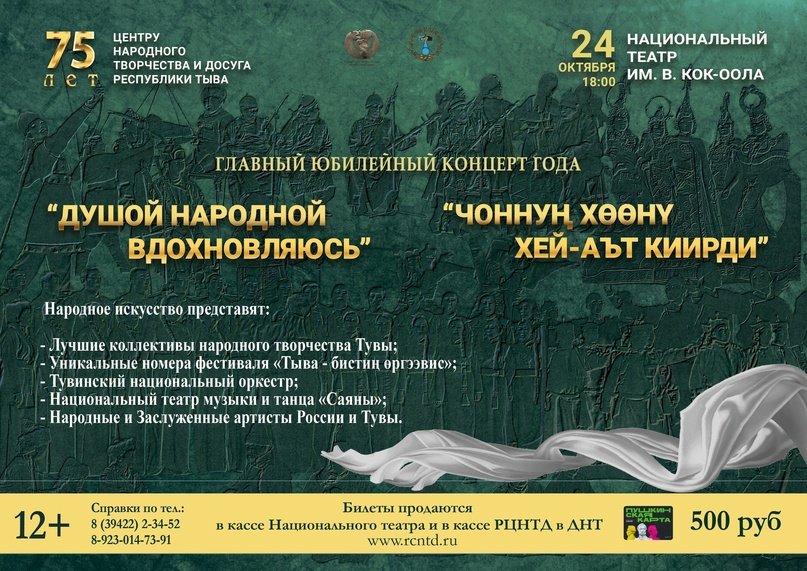 24 октября в Национальном театре имени В.Кок-оола состоится юбилейный вечер Республиканского центра народного творчества и досуга. Публике представят праздничный концерт с участием Народных и Заслуженных артистов России и Тувы, лучших коллективов народного творчества республики, Тувинского национального оркестра, Национального театра музыки и танца «Саяны» и уникальные номера фестиваля «Тыва - бистиң өргээвис».