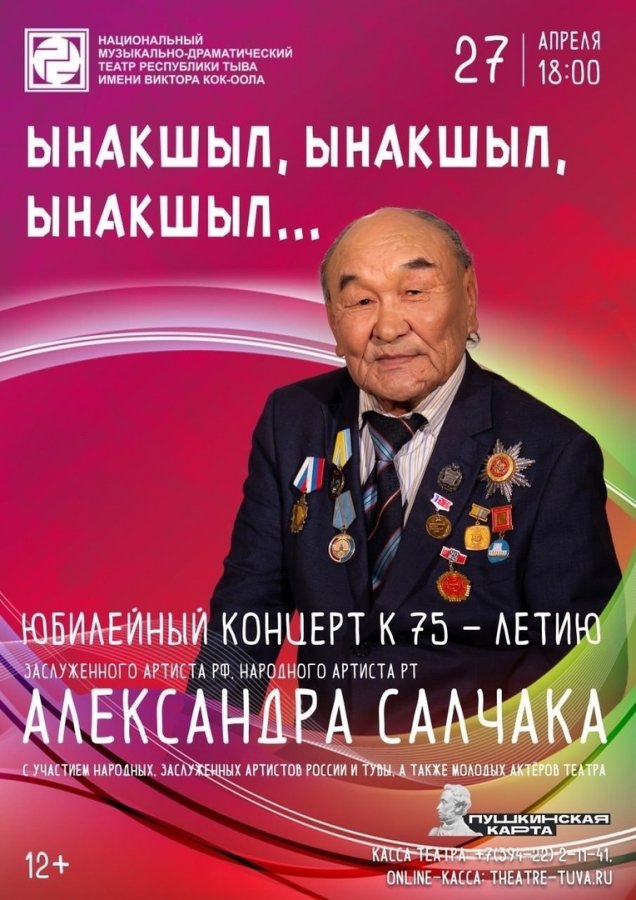 Заслуженный артист России, Народный артист Тувы, легенда тувинской сцены Александр Салчак 27 апреля приглашает на свой юбилейный концерт "Ынакшыл, ынакшыл, ынакшыл...", посвященный 75-летию!