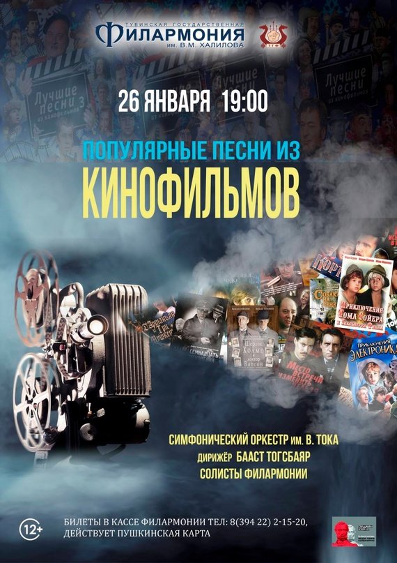 Уважаемые друзья Тувинская государственная филармония по многочисленным просьбам наших уважаемых зрителей 26 января в 19-00 часов повторяет концерт «Популярные песни из кинофильмов»!