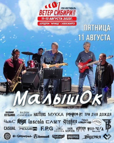 11-13 августа в Новосибирске на аэродроме "Мочище" состоится рок-фестиваль "Ветер Сибири". В этом году его участником будет и тувинская группа "Малышок". Название группы -"Малышок" - появилось в школе 7 г.Кызыла, в 70е годы, в Тувинской АССР. Ансамбль, состав которого менялся по мере взросления и окончания учеников школы, менялся на протяжении почти 20 лет. Неизменным был состав ансамбля, в нем была ритм группа, клавишные и духовая группа(труба, саксофоны). Репертуар состоял из произведений советских композиторов.