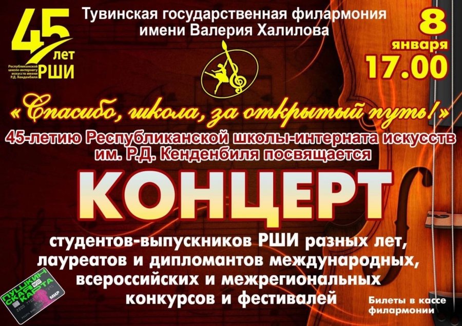 8 января в Тувинской государственной филармонии им. В.М. Халилова состоится Концерт выпускников школы – студентов образовательных учреждений культуры «Спасибо, школа, за открытый путь!»,
