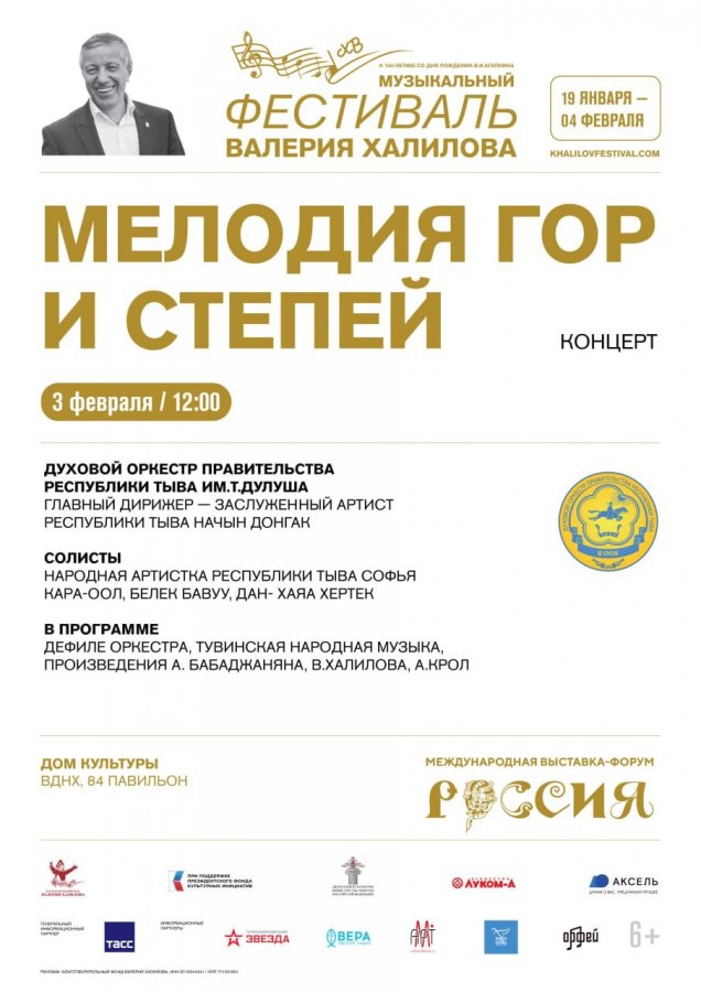 В Москву приезжает Духовой оркестр Правительства Республики Тыва им. Тимура Дулуша в рамках III Музыкального фестиваля Валерия Халилова. Почти 50 городов России принимают участие в III Музыкальном фестивале Валерия Халилова, главный гала-концерт которого состоится 2 февраля на ВТБ-арене.