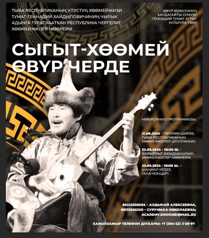Министерство культуры Тувы приглашает исполнителей горлового пения хоомей к участию в Республиканском конкурсе исполнителей хоомея «Сыгыт хоомей Овур черде», посвящённом светлой памяти Народного хоомейжи Республики Тыва Тумата Геннадия Хайдыповича.