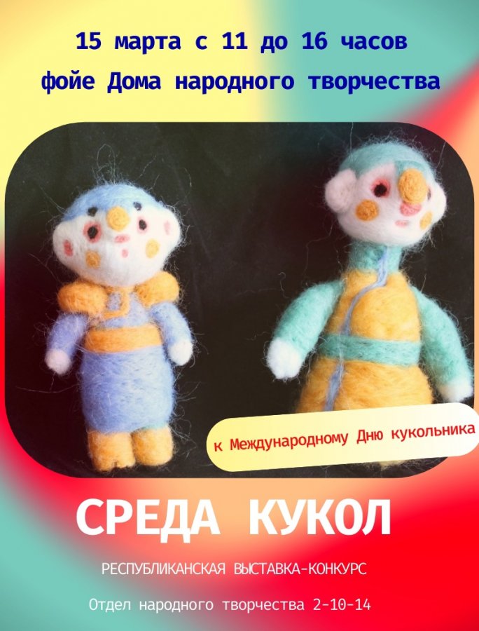 Мастеров-кукольников Тувы приглашают принять участие в ежегодной Республиканской выставке-конкурсе среди мастеров по изготовлению кукол "Среда кукол", посвященной Международному дню кукольника, Году педагога и наставника в России и Году народного сплоченности в Туве. Работы участников будут доступны и посетителям. 15 марта с 11 до 16 часов в фойе Дома народного творчества можно полюбоваться творениями мастеров-кукольников.