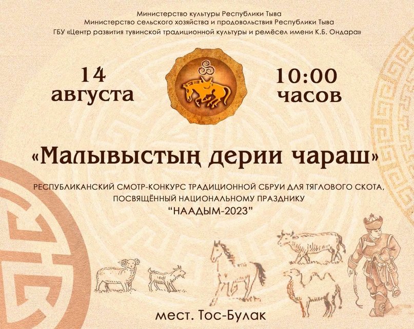С целью выявления и развития традиционных канонов изготовления тягловой сбруи, а также поддержки и выявления талантливых мастеров народно-художественных промыслов и декоративно-прикладного искусства Центр тувинской культуры совместно с Министерством сельского хозяйства и продовольствия РТ и Министерством культуры РТ проводит Республиканский смотр-конкурс традиционной сбруи для тяглового скота «Малывыстың дерии чараш», посвященный национальному празднику "Наадым-2023” .