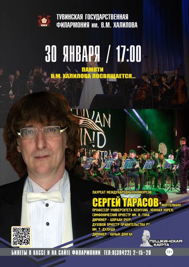 Сергей Тарасов - поистине рекордсмен-лауреат, обладатель уникального «послужного списка» побед на крупнейших соревнованиях, входящих во Всемирную Федерацию международных музыкальных конкурсов. Обладатель Гран-при и победитель многих конкурсов. В Туве он выступит в день рождения Валерия Михайловича Халилова.