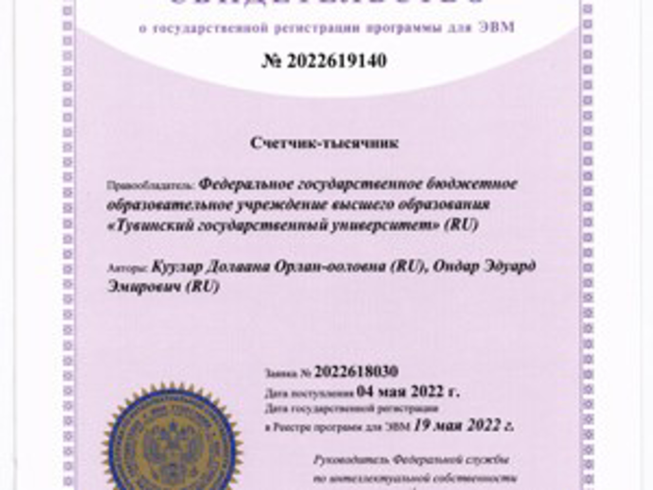 В 2022 году выпускник физико-математического факультета Вадим Терещук получил свидетельство о государственной регистрации программы для ЭВМ «Сканер QR-кодов». Работа над программой проводилась под руководством старшего преподавателя кафедры информатики Чойганы Домур-оол. Также зарегистрирована программа мобильного приложения «Тувинские сканворды» с базой данных тувинских загадок и поговорок для операционной системы Android в среде разработки Android Studio. Автор - студент физико-математического Субудай Иргит получил свидетельство Федеральной службы по интеллектуальной собственности о государственной регистрации программ для ЭВМП – его проект разработан под руководством старшего преподавателя кафедры информатики Севил Ондар. « В приложении содержатся около 100 тувинских загадок и поговорок, разложенные по разным тематическим категориям. Например, «Кижи дугайында» («О человеке»), в которой будут загадки и поговорки об особенностях человеческого организма. В категории «Бойдус дугайында» («О природе») есть устное народное творчество на темы стихийных явлений, времен года, названий растений и т.д. Ответ собирается буквами, расставленными случайным образом », - объясняет Субудай Иргит. Кроме того, свидетельство Федеральной службы по интеллектуальной собственности о государственной регистрации программы для ЭВМ «Счетчик-тысячник» получил магистрант ФМФ Эдуард Ондар и доцент кафедры информатики Долаана Куулар. «Счетчик-тысячник» – это устройство для автоматического подсчета поголовья и идентификации сельскохозяйственных животных. « Выполненный анализ выявил, что наиболее близким аналогом является устройство RFID-туннель BioControl WRL-70, произведенное в Норвегии. Разработка нвшего студента решит вопрос высокой стоимости по сравнению с аналогом. Программа позволяет одновременно рассчитать и учесть передвижение поголовья скота, она предназначена для сельскохозяйственных предприятий, частных крестьянских хозяйств, чабанов-тысячников », - говорит Долаана Куулар.