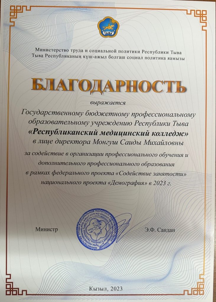 По итогам участия центров обучения региона в данном проекте 27 декабря 2023 года в Тувинском строительном техникуме прошел круглый стол, где работа нашего колледжа была отмечена благодарностью Министерства труда и социальной политики Республики Тыва.