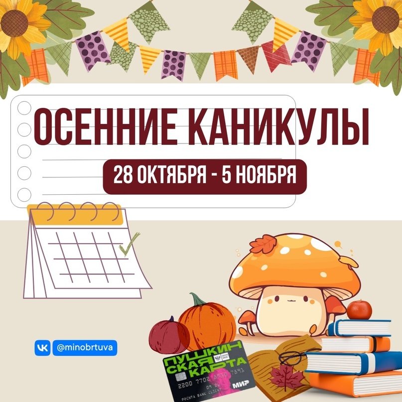 Сегодня начались долгожданные осенние каникулы, которые продлятся до 5 ноября. Это время, когда дети могут отдохнуть от школьной рутины и провести время интересно и с пользой. Минобразования Тувы напоминает, что на территории региона будут работать временные досуговые центры, секции и кружки. Пройдет отборочный этап соревнований «Мини-футбол в школу». Подробную информацию о работе ВДЦ и учреждений допобразования вы можете узнать в школах, где обучаются ваши дети.