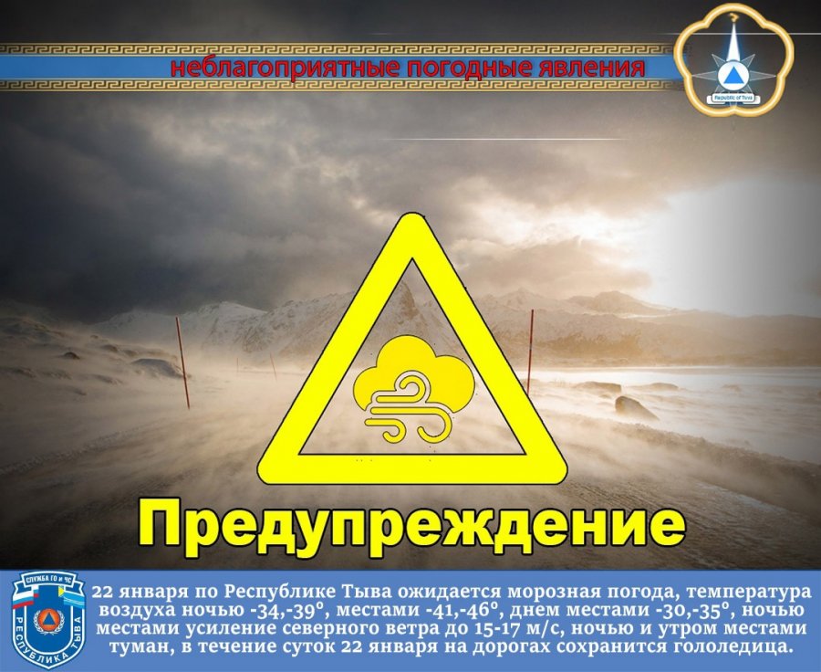По Республике Тыва в ближайшие сутки ожидается переменная облачность, ночью местами небольшой снег, днем без существенных осадков. Ветер северный 2-7 м/с, местами порывы до 12 м/с, ночью в горах местами до 17 м/с. Температура воздуха ночью -34,-39°, местами -41,-46°. Температура воздуха днём -23,-28°, местами -30,-35°. Ночью и утром местами туман. На дорогах гололедица.