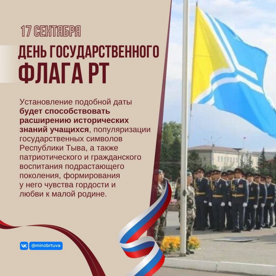 Этот сентябрьский день знаменателен тем, что флаг, как главный символ Тувы, был утвержден Верховным Советом республики именно 17 сентября 1992 года. Автор государственного флага Республики Тыва Оюн-оол Доктугуевич Сат - художник, член Союза журналистов России. Флаг Республики Тыва - голубое прямоугольное полотнище с наклонными белыми и голубыми полосами, исходящими из верхнего и нижнего углов со стороны древка. Исходящие из верхнего и нижнего углов флага полосы символизируют протекающие по территории Тывы реки Большой Енисей (Бий-Хем) и Малый Енисей (Каа-Хем), а образуемая ими полоса, идущая вдоль полотнища флага, — Верхний Енисей (Улуг-Хем), результат слияния двух первых в месте нахождения Кызыла.