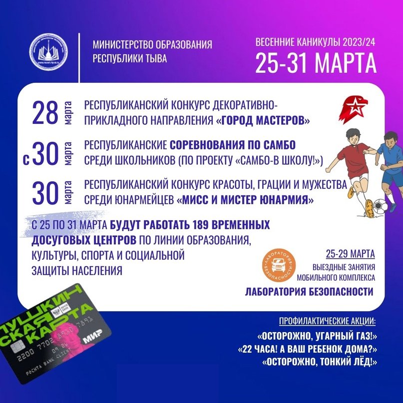 Сегодня, 25 марта в школах Тувы стартовали весенние каникулы - время отдыха и развлечений для школьников! Встречаем тепло и солнце, наслаждаемся прогулками на свежем воздухе и участвуем в интересных мероприятиях.