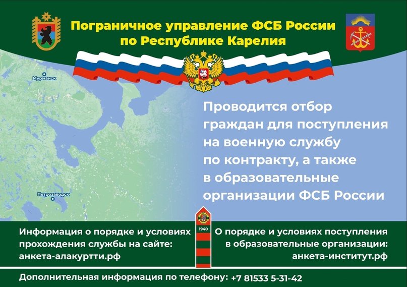 Пограничное управление ФСБ России по Республике Карелия проводит отбор граждан из числа студентов, окончивших (оканчивающих) образовательные организации в 2023 (2024) году, для поступления на службу в органы безопасности Российской Федерации без прохождения военной службы по призыву. Информация о порядке и условиях прохождения службы размещена на сайте: анкета-алакуртти.рф .