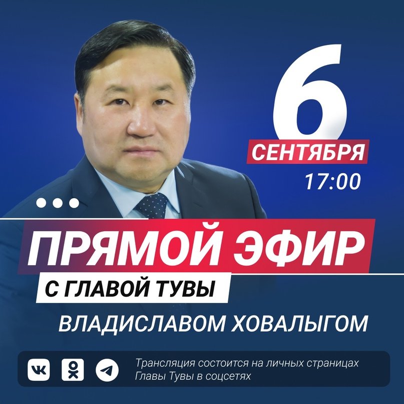 6 сентября в 17:00 Глава Тувы Владислав Ховалыг проведёт прямой эфир с жителями республики.