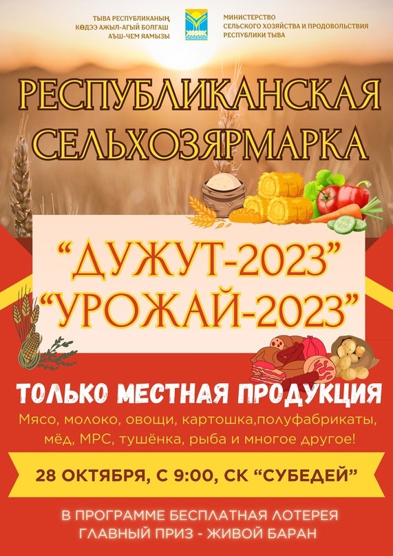 Министерство сельского хозяйства Тувы приглашает жителей и гостей республики на главное событие года - республиканскую сельхозярмарку «Дужут-2023»/«Урожай-2023», которая пройдет 28 октября в г. Кызыле.