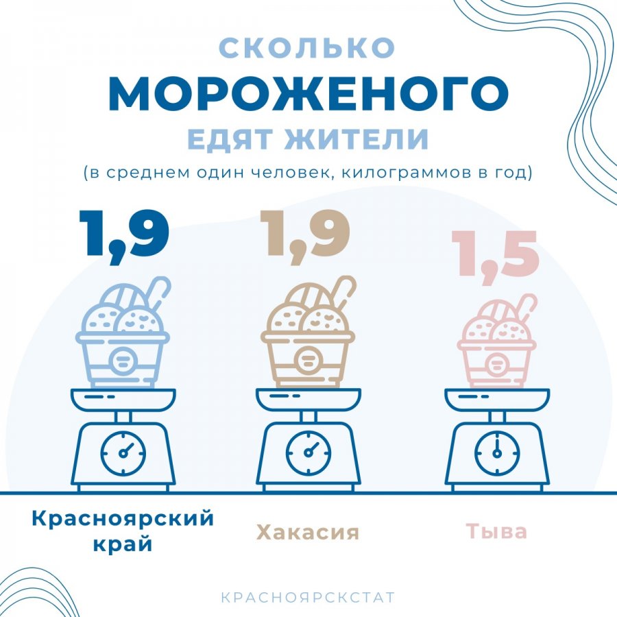 Один житель Красноярского края за год в среднем съедает 1,9 килограмма мороженого или 24 эскимо. Чаще других его потребляют горожане — 2 килограмма. Жители сельской местности на 500 граммов меньше. Больше всех любят сладкое лакомство в семьях с одним ребёнком — 2,3 килограмма на человека.