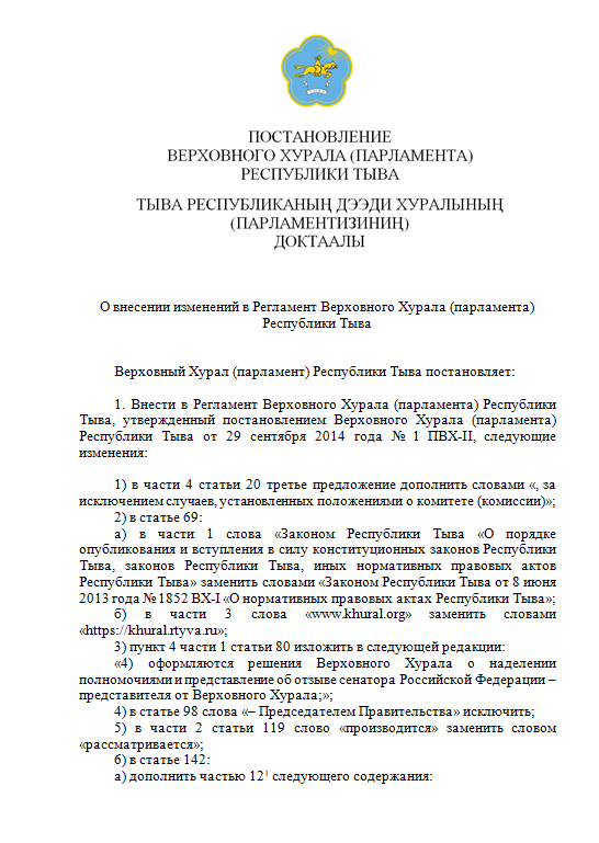 Постановление Верховного Хурала (парламента) Республики Тыва «О внесении изменений в Регламент Верховного Хурала (парламента) Республики Тыва»