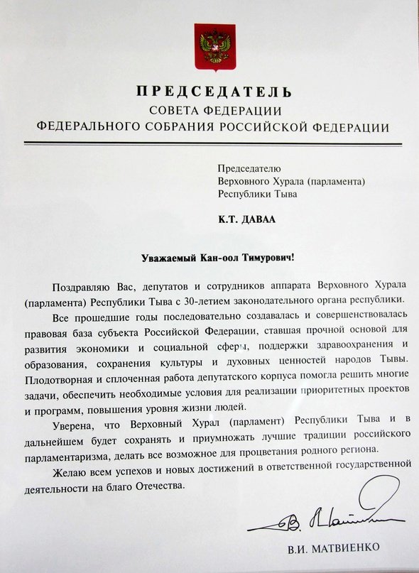 «Плодотворная и сплоченная работа депутатского корпуса помогла решить многие задачи, обеспечить необходимые условия для реализации приоритетных проектов и программ, повышения уровня жизни людей. Уверена, что Верховный Хурал (парламент) Республики Тыва и в дальнейшем будет сохранять и приумножать лучшие традиции российского парламентаризма, делать все возможное для процветания родного региона», – говорится в поздравлении.