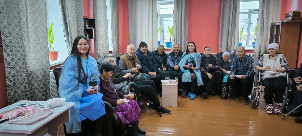 Мы угостили бабушек сладостями и побеседовали с ними, создавая атмосферу тепла и уюта. В дополнение к этому, мы устроили небольшой концерт, на котором выступали начинающие и талантливые будущие звёзды — Субудай Хажыт и Сайын-Херел Опей! Их музыка наполнила сердца бабушек радостью и гордостью за молодое поколение.