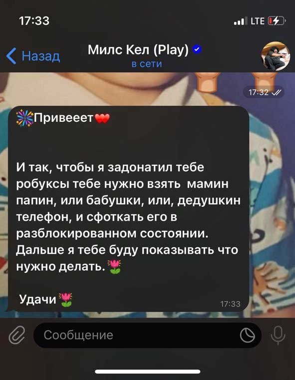Ничего не подозревающая школьница попросила мамин смартфон для участия в раздаче «робуксов» и отправила фотографию разблокированного телефона. Далее мошенник написал ей, что и куда нажимать на смартфоне матери, а именно он обвел кружочком мобильное приложение, указав, что необходимо нажать на «зеленый круг на белом фоне» и попросил туда зайти.