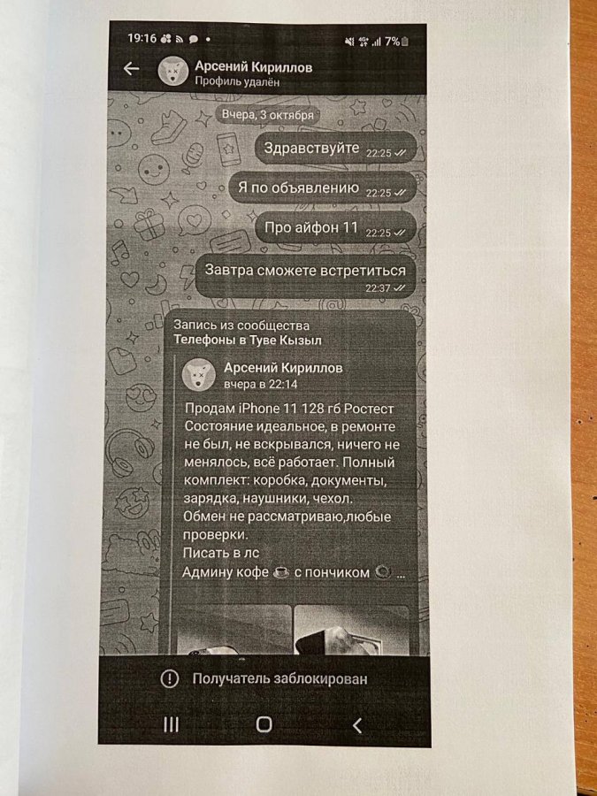 Потерпевший рассказал, что его дочь с целью обновить телефон занималась поисками подходящего телефона в сети интернет, в ходе поиска нашла подходящее объявление о продаже сотового телефона марки «Айфон 11» и списалась с автором объявления в личном сообщении.