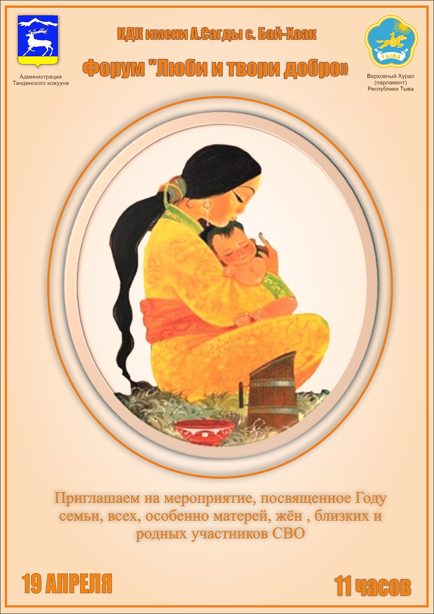 19 апреля в 11 часов в КДК имени А.Сагды с. Бай-Хаак состоится форум "Люби и твори добро", под руководством Верховного Хурала Республики.