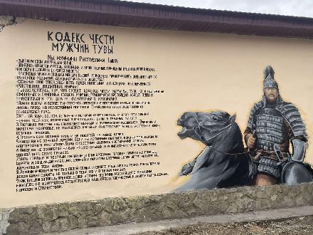 На стене рядом с изображением мужчины, ребята буквально вчера дописали текст: «Кодекс чести мужчин Тувы», который был принят 16 ноября 2012 года на Втором республиканском Форуме отцов в городе Кызыле. Инициатором данной идеи стал молодой предприниматель Тумен Сендажы, команда которого и писала текст Кодекса. Его идея была поддержана отделом молодежной политики мэрии, целью которого является пропаганда здорового образа жизни, воспитание чувства патриотизма и сохранение традиционных ценностей среди молодежи.
