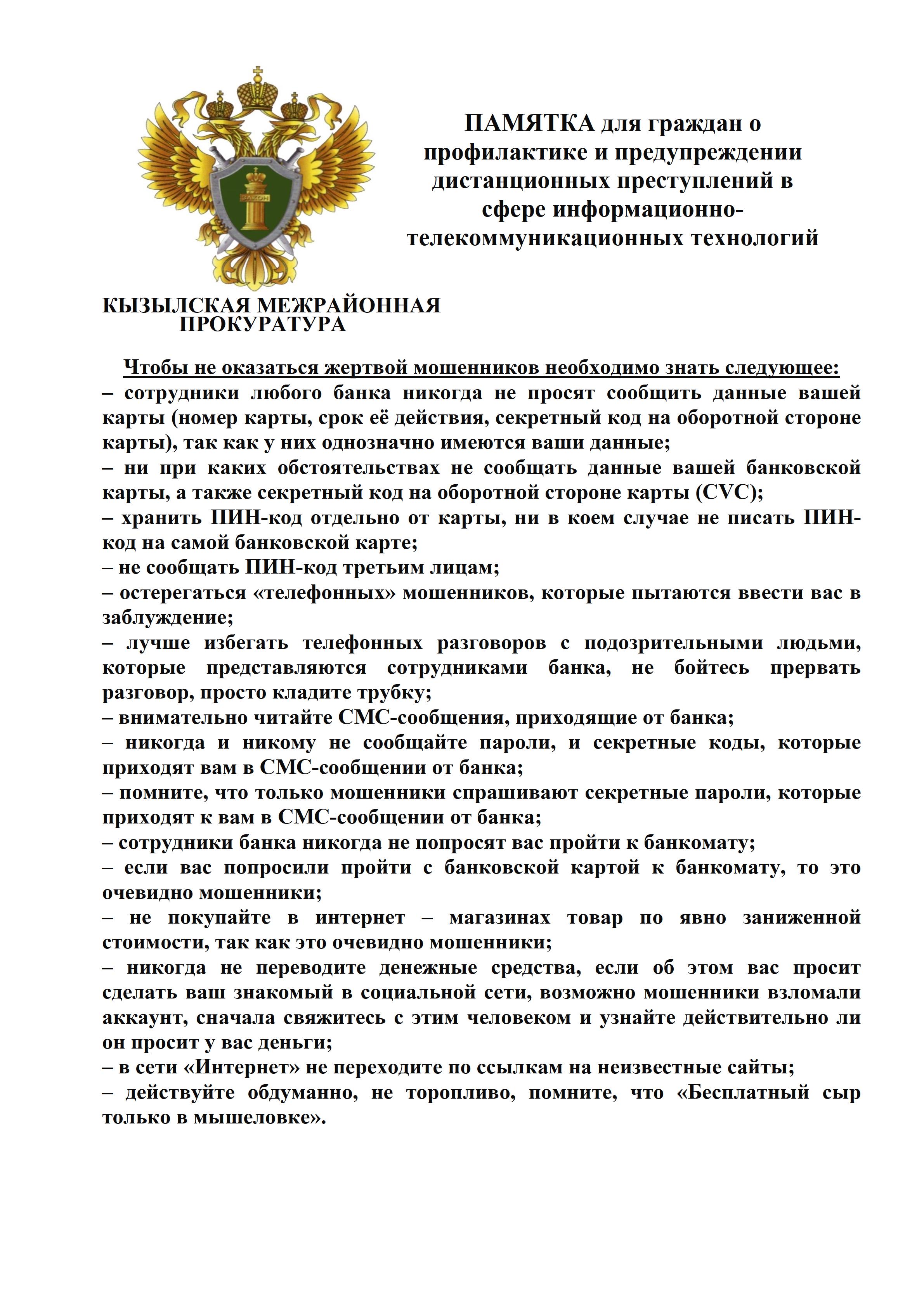 ПАМЯТКА для граждан о профилактике и предупреждении дистанционных преступлений в сфере информационнотелекоммуникационных технологий
