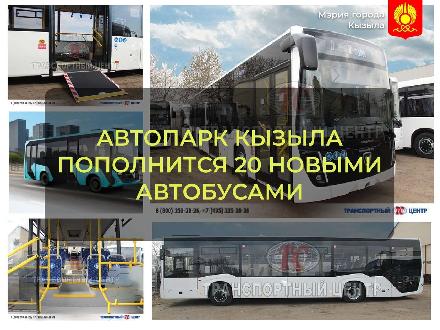 В Кызыл в ближайшее время привезут 20 новых автобусов, которые будут ездить по городским маршрутам. В настоящее время специалисты городской администрации готовятся к подписанию контракта с ГТЛК (Государственная транспортная лизинговая компания). Руководством мэрии была проделана большая работа по изучению условий, выбору транспорта и составлению договора. Механизм льготного лизинга ГТЛК способствует оперативному обновлению парков. А серийный заказ обеспечивает комфортную стоимость городского транспорта для регионов.