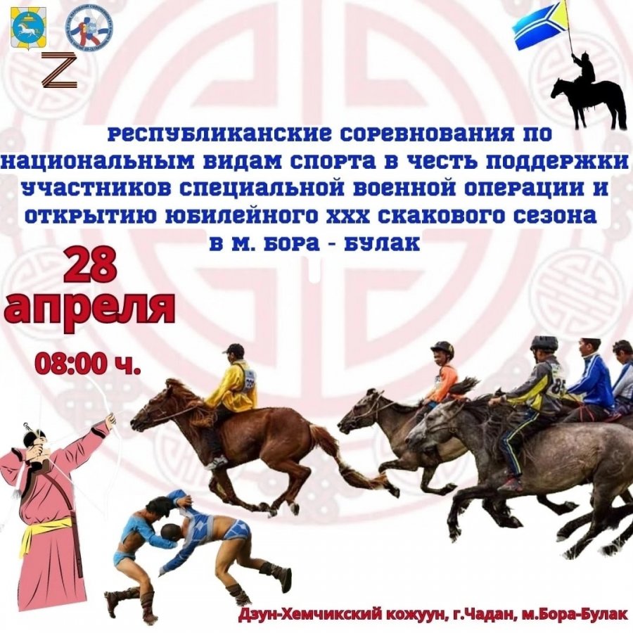 Конные скачки намечены на 28 апреля в местечке Бора-Булак близ города Чадана Дзун-Хемчикского района. Начало соревнований в 8.00 часов.