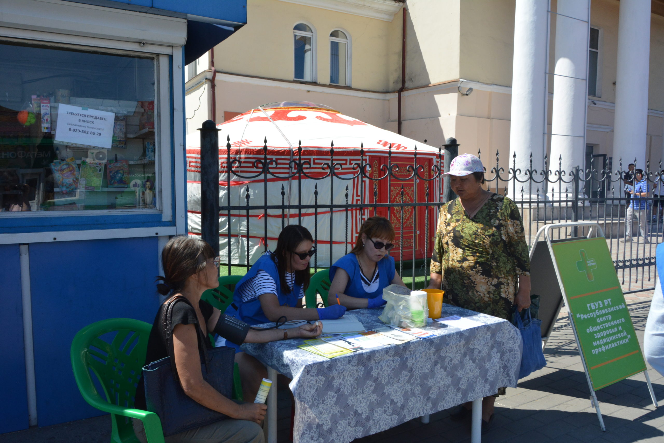 Специалистами Республиканского центра общественного здоровья и медицинской профилактики была организована площадка здоровья, где желающие имели возможность проверить уровень артериального давления, сдать экспресс-анализ для определения уровня сахара в крови. В рамках акции специалисты Центра раздавали профилактические материалы о здоровом образе жизни, двигательной и физической активности, правильном питании, профилактике инсульта, об отказе от табакокурения и алкоголя.