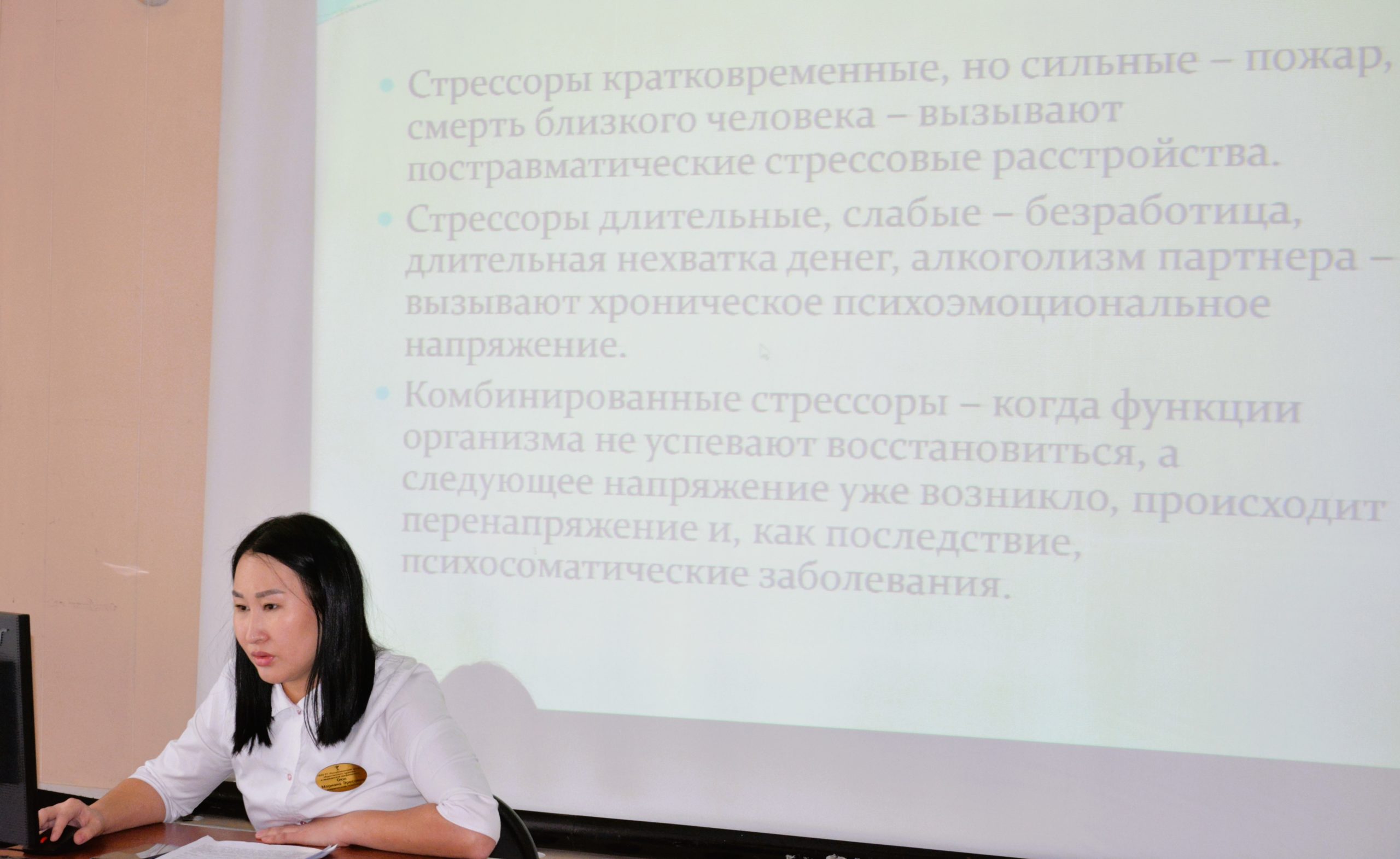 В начале мероприятия Мариана Оюн выступила с презентацией, где рассказала о душевном комфорте, методах борьбы со стрессом, синдроме профессионального выгорания, его факторах, стадиях и симптомах. Далее медицинский психолог провела с сотрудниками тестирование на диагностику степени эмоционального выгорания.
