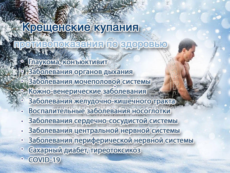 В условиях сохраняющихся высоких рисков распространения острых респираторных вирусных инфекций, гриппа, внебольничных пневмоний и новой коронавирусной инфекции (COVID-19) лицам, планирующим совершить обряд Крещенского купания в проруби, рекомендуется обязательно посоветоваться с врачом.От участия в купании необходимо воздержаться лицам с высоким риском тяжелого течения гриппа, COVID-19 (людям старше 60 лет, лицам, страдающих хроническими заболеваниями, в первую очередь болезнями органов дыхания, сердечно-сосудистой системы, диабетом). Также не допустимо к участию в обрядовых мероприятиях лиц, имеющих признаки респираторных заболеваний.