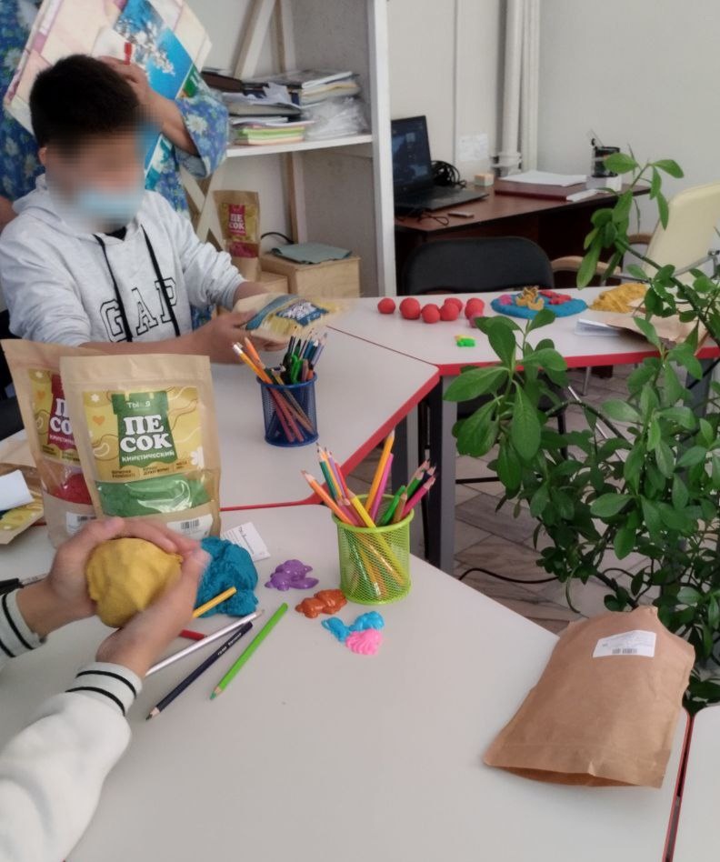 На фото: клинический психолог Азиймаа Соян проводит занятие "песочная терапия" для подростков 12-15 лет детского отделения.