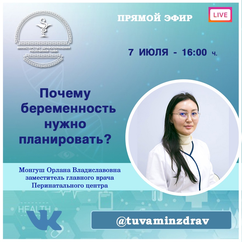 7 июля в 16.00 ч. заместитель главного врача Перинатального центра Орлана Монгуш проведет прямой эфир в социальной сети «ВКонтакте» в преддверии Дня семьи, любви и верности.