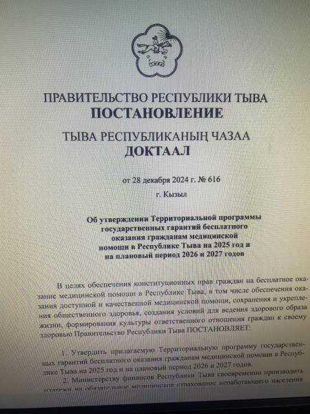 Утверждена Территориальная программа государственных гарантий бесплатного оказания гражданам медицинской помощи в Республике Тыва на 2025 года и на плановый период 2026 год и 2027