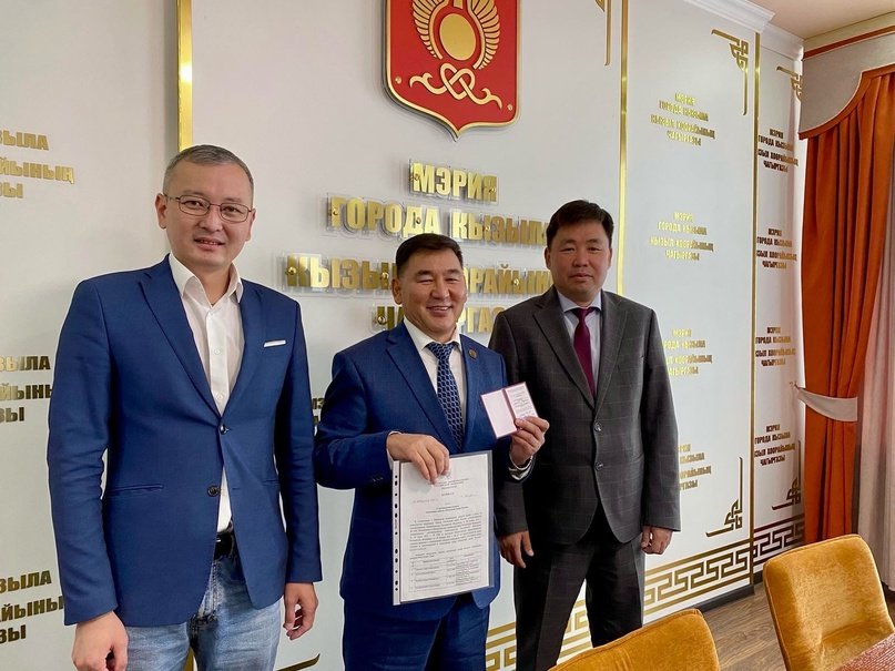 Заместитель мэра по правовым вопросам и профилактике правонарушений Монге-Назын Могедир удостоен звания Почётный донор Российской Федерации. Главный врач ГБУЗ РТ «Станция переливания крови» Аяс Ондар торжественно поздравил и вручил подтверждающие знак и удостоверение:
