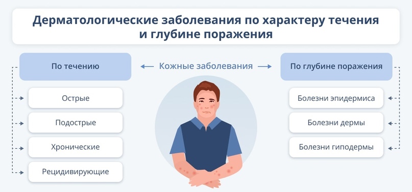 Для каждого слоя кожи характерны специфические болезни. Например, к числу патологий верхнего наружного слоя — эпидермиса — относятся такие заболевания, как чесотка и псориаз. Соединительная часть кожи — дерма — может страдать в результате фурункулеза или гидраденита — гнойного воспаления потовых желез.